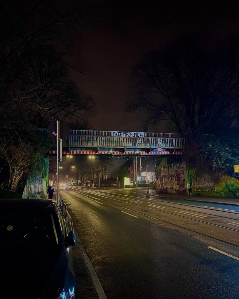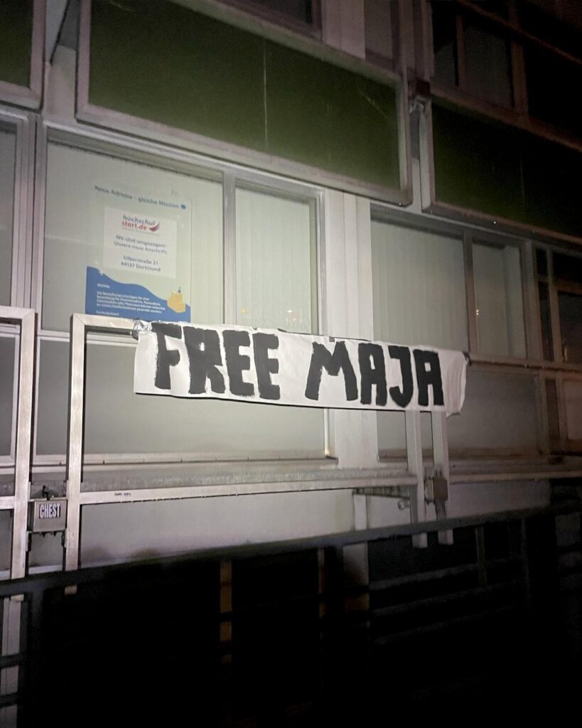 Anlässlich des antifaschistischen internationalen Aktionstags für Maja sind auch in Dortmund Solidaritätsbekundungen aufgetaucht. In der Innenstadt zwischen Kreuzviertel und Nordstadt und auch weiter draußen in Körne und Hörde sind mehrere Free Maja Banner aufgetaucht.